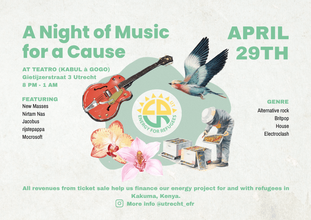 Join us on April 29th at 20:00 at Teatro (KABUL Ă GoGo) in Utrecht for a night of live music and great vibes, all in support of our 2026 project Greening Kalobeyei in Kakuma refugee camp, Kenya.Â